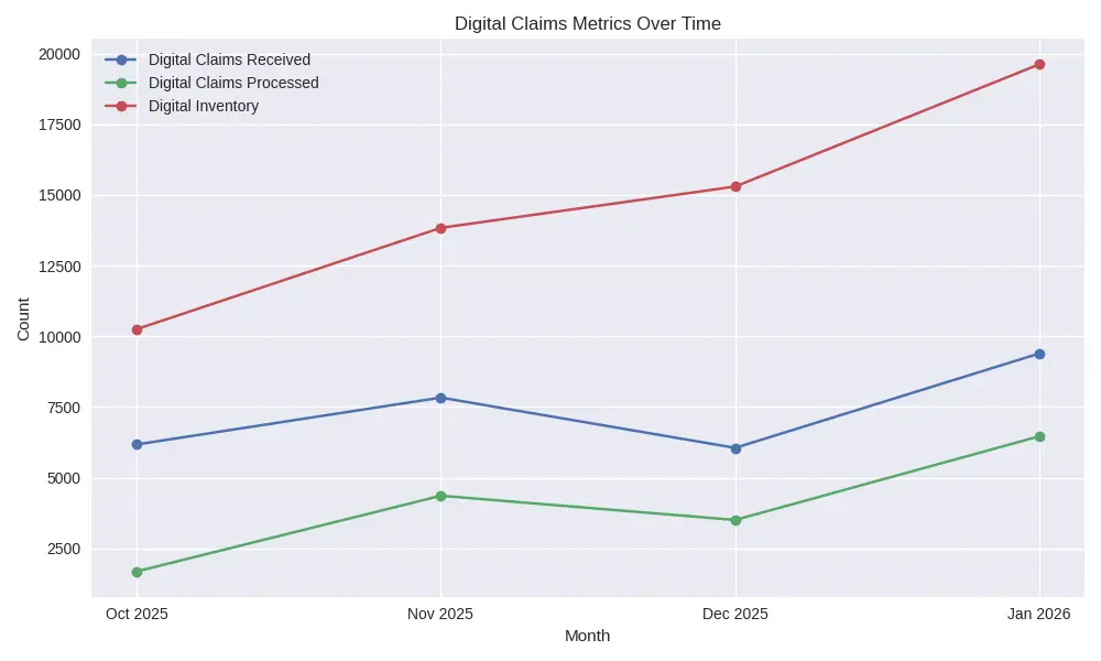 | Month | Digital Claims Received | Digital Claims Processed | Digital Inventory |