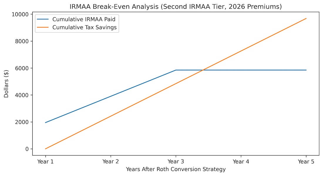 Although Roth conversions trigger temporary Medicare IRMAA surcharges, the reduction in future RMD-driven taxes can exceed the IRMAA cost within a few years. After the break-even point, the strategy produces ongoing annual tax savings and improved flexibility for surviving spouses.